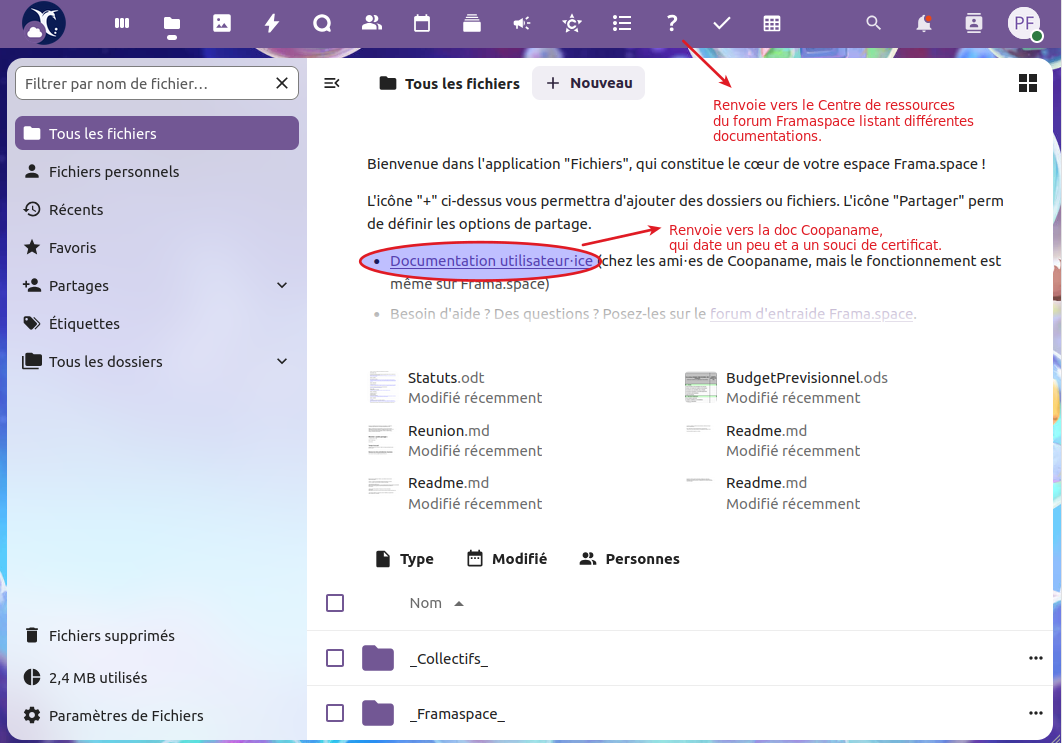- [11/09/2024] Documentation Framaspace par @Cyp pour l’asso Terre d’Ancrages