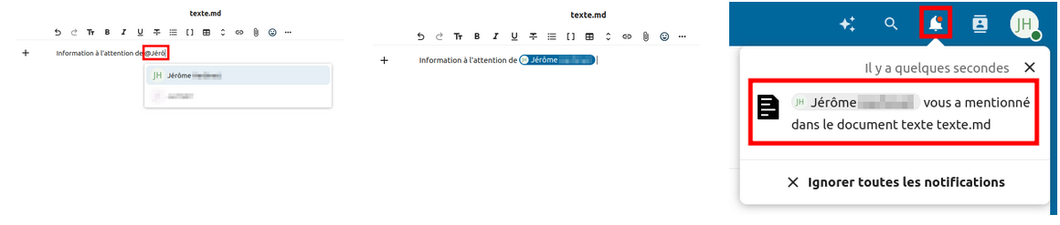 Il est maintenant possible de mentionner des personnes (utilisateurs de la plateforme) en commençant par taper « @ », puis en recherchant l’utilisateur en question. Ce dernier recevra une notification push l’informant qu’il a été mentionné dans tel ou tel document. En cliquant sur le nom du document, il pourra directement ouvrir ce dernier.