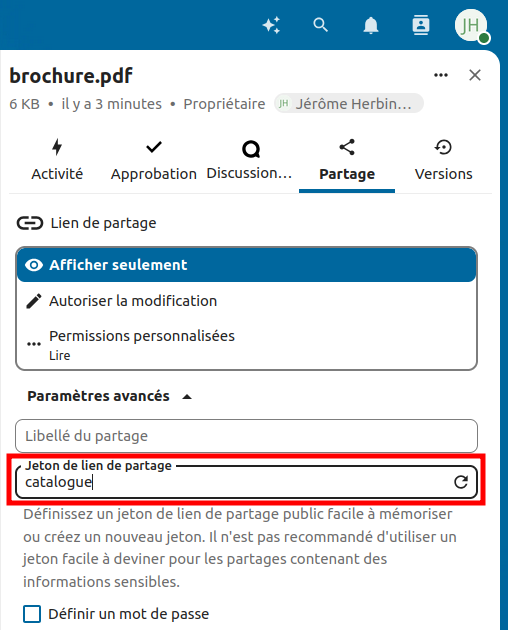Ainsi, dans l’exemple ci-dessus, l’URL initiale du partage « https://ma-super-asso.frama.space/s/ewZSkDeTtmAdfoX » devient « https://ma-super-asso.frama.space/s/catalogue »