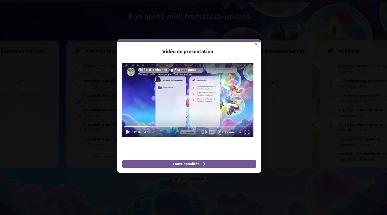 Nous avons ajouté, dans la suite d’écrans de présentation de Framaspace, une courte vidéo de présentation :