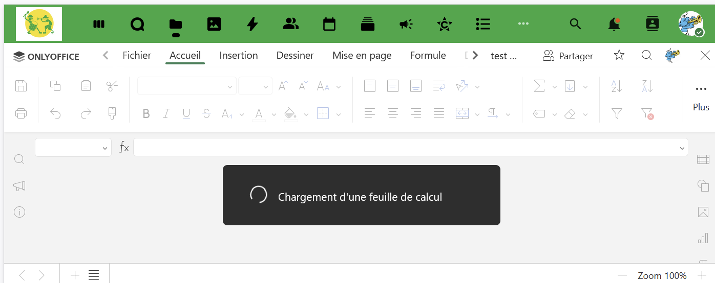 Je constate depuis ce matin que je n’arrive pas à ouvrir les documents ONLYOFFICE (tableur .xlsx ou .docx) : la fenêtre de chargement gèle indéfiniment avec le message “Chargement d’une feuille de calcul”.
